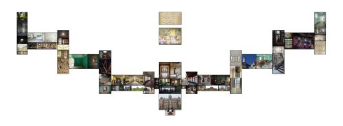 Figure 1. Photographic collage of Thomas Story Kirkbride’s “Improved Linear Plan” for an idealized hospital for the mentally ill, from the second edition of his influential treatise (1880). Sixty images of thirteen Kirkbride Plan hospitals are featured in the photography of eleven PreservationWorks members, including Lisa Marie Blohm, Katie Carlisle, Yvonne Laube, Robert Lewis, Rachael Pollack, Ray Staten, Rusty Tagliareni + Christina Mathews, Jaime Tirado, and Vincent Verna, and Robert Kirkbride. The visual documentation of decay in these hospitals supports efforts to record, preserve, and adaptively reuse remaining structures. Four of the “Kirkbride Plan” hospitals represented have since been demolished, six have been preserved and repurposed, and three are currently at risk.